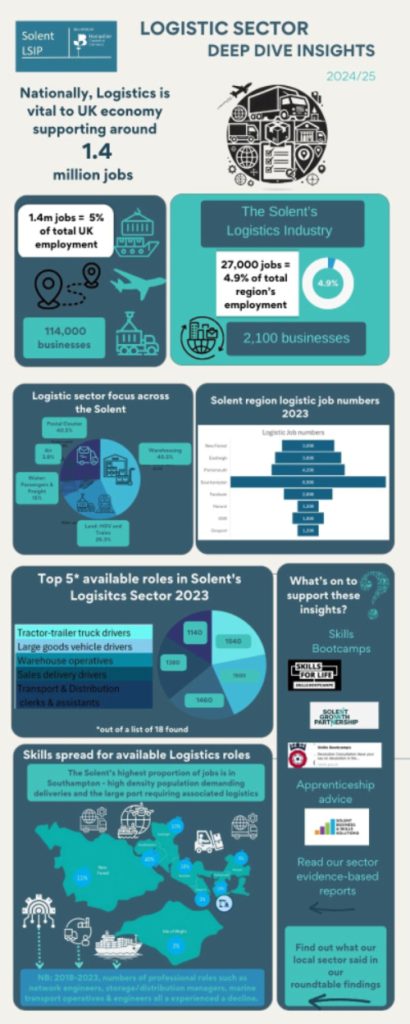 The logistics sector is a powerhouse of the UK economy, covering a dynamic range of services spanning land, sea, and air transportation, handling everything from goods to people. Hampshire Chamber of Commerce offers a program of webinars and training to support this sector. A full range of Global and International Trade courses focusing on Import/Export procedures and documentation, can be found through the link. This suite of opportunities is open to all, but discounted for members. Initiatives like the Maritime transport and Logistics Bootcamp (Level 3), supported by the Local Skills Improvement Fund, address local skills shortages directly. By offering industry-endorsed training and micro-courses tailored to logistics and supply chain needs, we can ensure that workforce development aligns with local industry demands. Read our employer roundtable presentation to find out more detail on pages 6, 7 & 8: Read our full Logistics employer roundtable summary here:The Solent’s thriving port and maritime cluster is identified as a top priority under the Levelling Up White Paper, unlocking bold new opportunities for trade and logistics. With a prime strategic location, the region is poised to dominate automotive shipments, battery logistics, and electric vehicle transhipment.